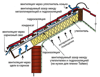Такая конструкция обеспечивает стекание конденсата прямо в желоб. В зависимости от конфигурации свеса крыши предусмотрен вариант вывода гидроизоляции без покрытия последней доски обрешётки.