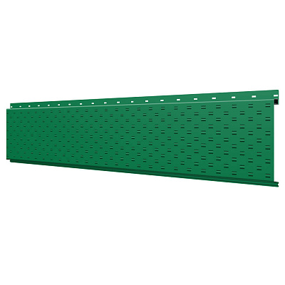 Линеарная потолочно-стеновая панель с ПЕРФОРАЦИЕЙ для вентиляции цвет RAL6029 Зеленая Мята применяется в качестве софитов для подшивы крыши, наружной и внутренней отделки потолков, стен, фронтонов фасада дома в Саратове.