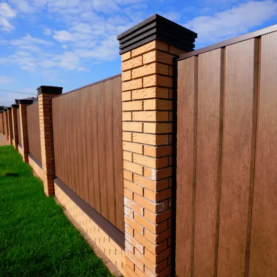 Забор из металлосайдинга Евро-Брус под брус Темный Каштан 3D Принтек, Колпак Bona Хай-Тек Коричневый на заборе из металлосайдинга Евро-Брус