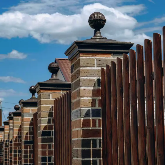 Забор жалюзи Еврожалюзи RAL8019 Темный Шоколад двусторонний, Колпак Monblan Коричневый, шар с подфонарником на столбах забора