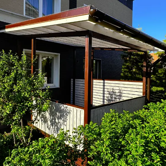 Входная группа из металло планкена RAL8017 Шоколад, Беседка из металлопланкена Светлая Береза SteelArt под дерево
