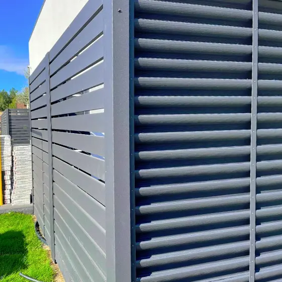 Секция забора жалюзи из ламелей еврожалюзи RAL7024 МАТТЕ Серый Графит с кирпичными столбами анфас двусторонний Вид спереди забор ламели еврожалюзи RAL7024 МАТТЕ Серый Графит матовый двусторонний Вид сзади забор ламели еврожалюзи RAL7024 МАТТЕ Серый Графит матовый двусторонний Ламели еврожалюзи RAL7024 МАТТЕ Серый Графит матовый двусторонний Ламель Еврожалюзи RAL7024 МАТТЕ Серый Графит двусторонний для заборов-жалюзи, беседок, пергол